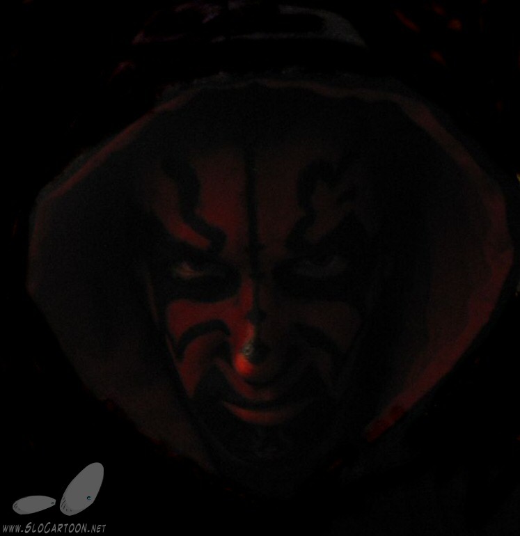 klikni na sliko za povečavo | | Na zabavo je bilo potrebno priti zamaskiran v pošast in ker se osebno nerad maskiram, sem se spomnil na Darth Maula, v katerega se lahko spremenil z dokaj enostavnim pobarvanim obrazom. Črne dele je povečini pobarvala žena, potem pa sem sam dokončal, dodal rdečo in popravil podrobnosti. | | + komentar